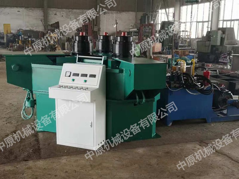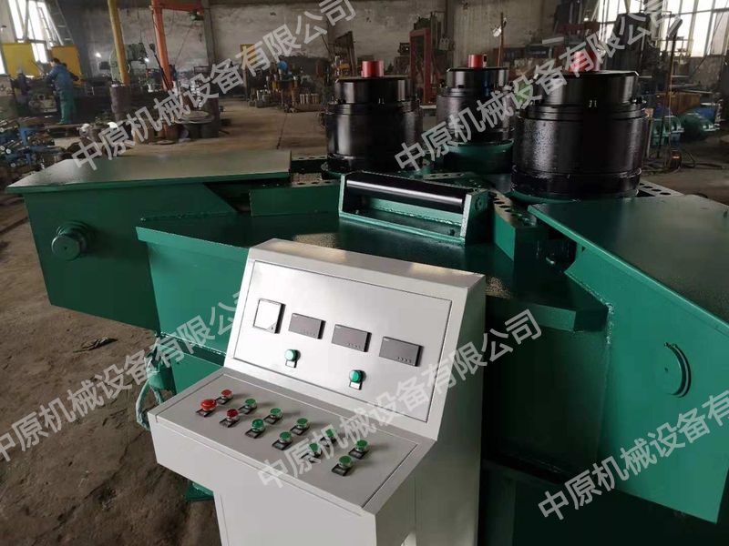 該機為叁輥型材卷圓機,集機電一體。電機輸出的較高轉速通過傳動裝置(聯軸器,液壓馬達,液壓油缸,齒輪等)轉換成所需的大扭矩低轉速,帶動兩主動輥實現旋轉運動,為型材行走提供扭矩。兩個主動輥中心距可調,被動輥通過液壓油缸前進、后退實現位移,來控制直徑大小。三個工作輥成等腰三角形分布,通過調整移動輥實現這三個點形成的弧線達到所需彎曲半徑,借助被動輥的壓緊及兩主動輥的旋轉運動,使型材經過多次連續彎曲,產生永久性塑性變形,用于常溫狀態下將型材卷制成圓形,弧形等工件。